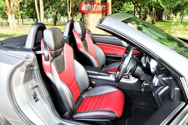 The SLC facelift simplified a fussy front and rear bumper as well as smoother front and rear lamp designs, adding to a more timeless elegance as suits it. The AMG version here is sometimes difficult to identify from the smaller engined versions but a unique single bar AMG grill double bubble bonnet, discreet rear lip spoiler and badging on the front wings help identify it.