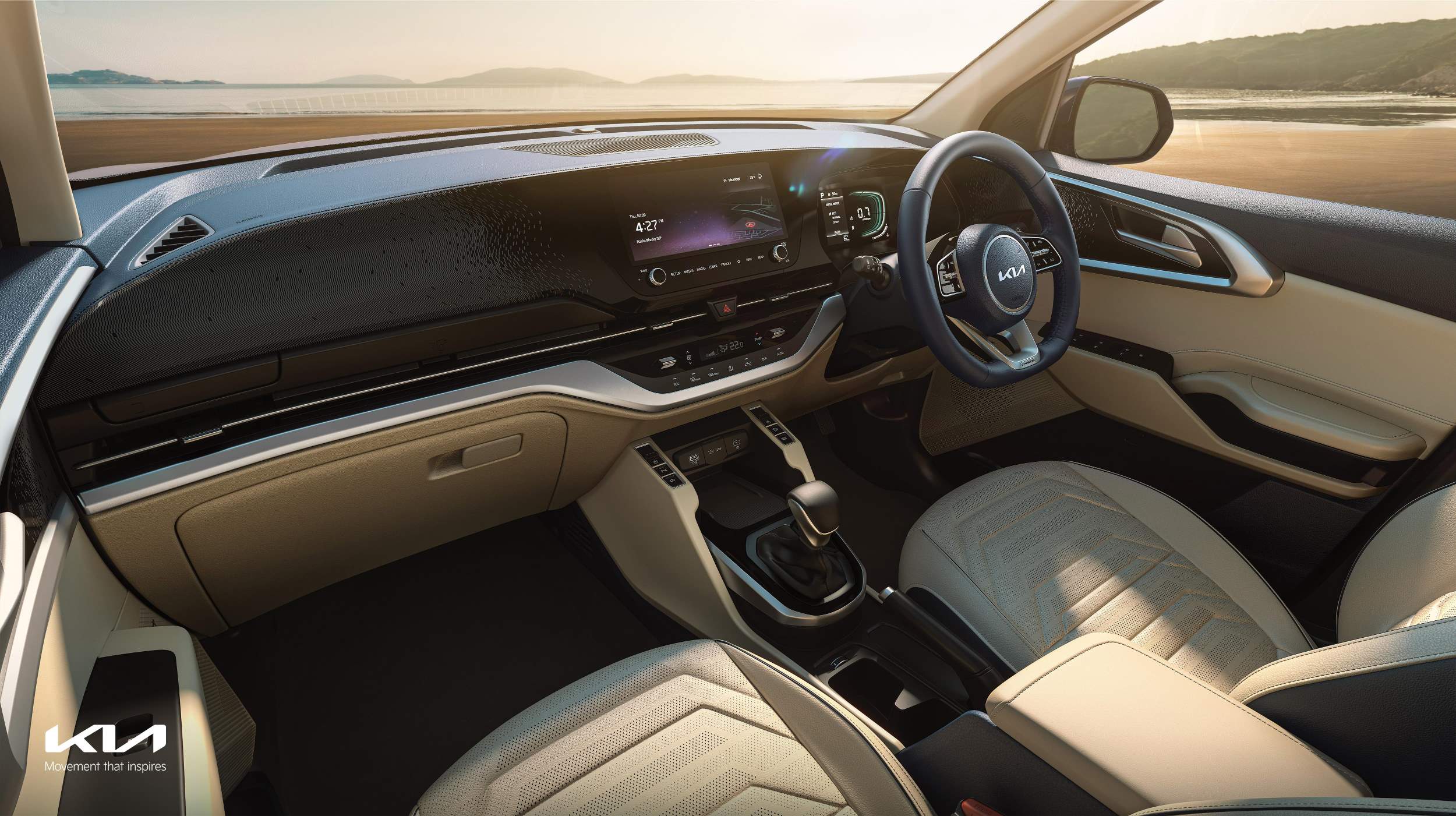 The interior of the Carens is significantly grown-up and features contoured surfaces, 64-colour ambient lighting, KIA Connect, AC vents for the second and third rows, a smart air purifier with claimed bacteria and virus protection, no less than five USB-C charging ports, ventilated front seats, electric folding second row seats for easier third-row access and plenty of storage nooks and crannies. A 10.25 inch touchscreen takes care of infotainment duties, whilst sound issues forth from a BOSE Premium Sound system with eight speakers.